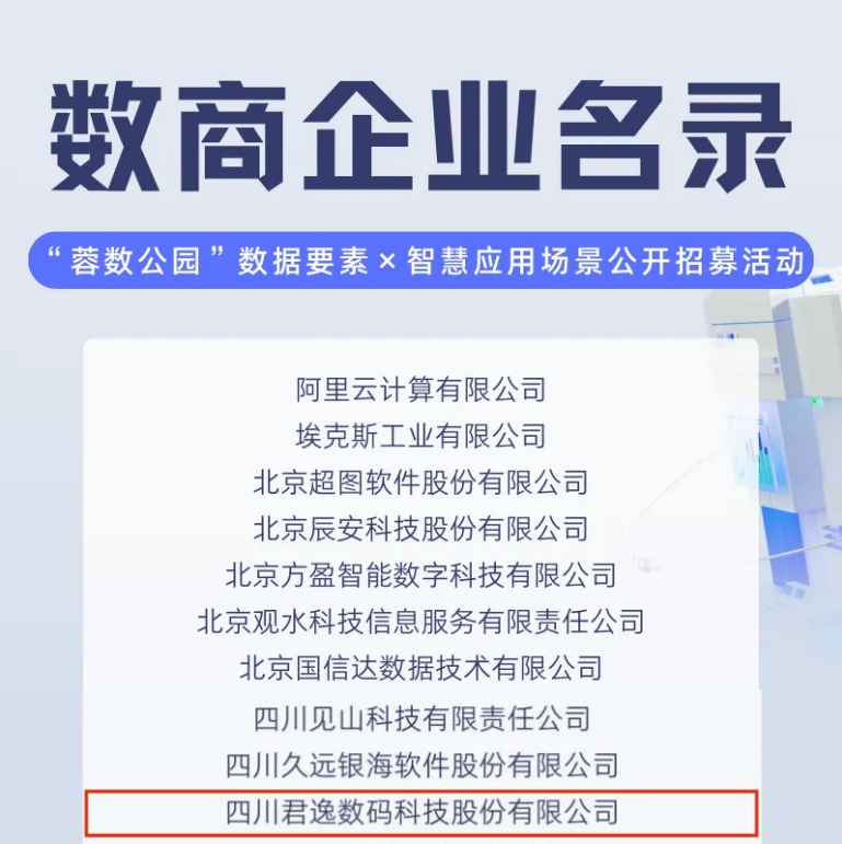 2024年6月13日,“蓉?cái)?shù)公園”-數(shù)據(jù)要素×智慧應(yīng)用場(chǎng)景入圍名單正式發(fā)布。君逸數(shù)碼成功入圍應(yīng)急管理-城市生命線、城市治理-智慧住建、智慧教育-智慧校園、智慧教育-教育資源數(shù)據(jù)融通四個(gè)建設(shè)標(biāo)包。成功上榜“蓉?cái)?shù)公園”首批數(shù)商企業(yè)名錄。