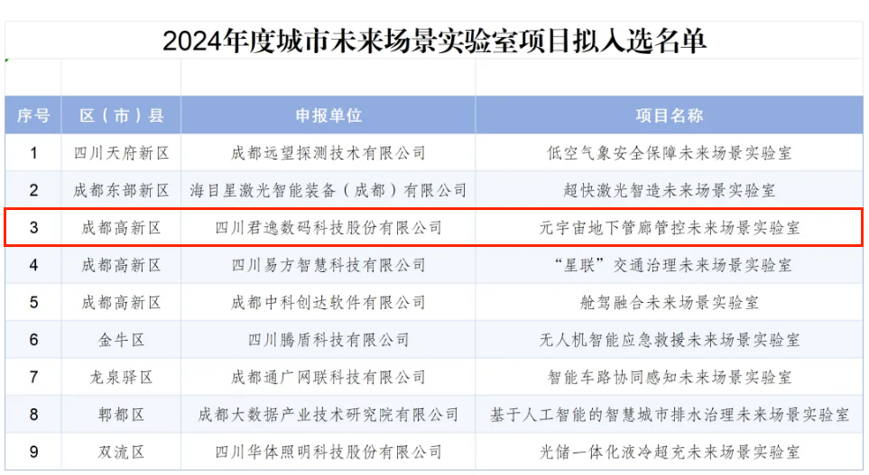 近日,成都市經(jīng)濟(jì)和信息化局對(duì)外發(fā)布了2024年度成都市創(chuàng)新應(yīng)用實(shí)驗(yàn)室、城市未來場(chǎng)景實(shí)驗(yàn)室、標(biāo)桿場(chǎng)景項(xiàng)目擬入選項(xiàng)目的公示名單。君逸數(shù)碼“元宇宙地下管廊管控未來場(chǎng)景實(shí)驗(yàn)室”成功入選2024年度成都市城市未來場(chǎng)景實(shí)驗(yàn)室項(xiàng)目。