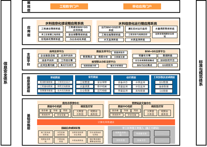 亭子口灌區(qū)一期工程水利信息化系統(tǒng)利用計算機技術、數(shù)據(jù)庫技術、網(wǎng)絡及通信技術,建設水量調(diào)度、閘門監(jiān)控、視頻圖像監(jiān)控、水質(zhì)監(jiān)測、灌區(qū)水量自動監(jiān)測、工程安全監(jiān)測、泵站監(jiān)控、控制綜合信息服務等應用系統(tǒng),并在這些系統(tǒng)基礎上,實現(xiàn)“全面遵循國際、國內(nèi)及四川省水利行業(yè)的標準。以一體化綜合管控平臺為應用核心,基于BIM+GIS的工程設計、建設與運行的一體的覆蓋全部灌區(qū),強調(diào)信息的標準化、共享集成及綜合利用,涵蓋整個灌區(qū)安全管理的全部業(yè)務流程,實現(xiàn)灌區(qū)工程流程化的業(yè)務管理,實現(xiàn)工程各類信息的統(tǒng)一采集和一體化的綜合應用。通過水利信息化系統(tǒng),及時掌握水情和工程安全信息,監(jiān)控現(xiàn)場情況,輔助調(diào)度決策,實施遠程精準調(diào)度的建設目標。提高工程管理的科學性和有效性,保證工程取退水信息傳入國家水資源監(jiān)控系統(tǒng),保證工程安全運行,促進水資源合理分配,提高水資源利用效率,最大限度地發(fā)揮工程效益。