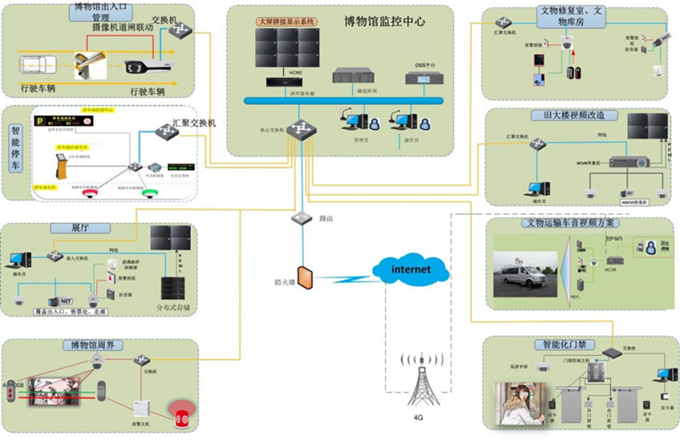 系統(tǒng)采用模塊化設(shè)計(jì),包括視頻監(jiān)控、門禁、車輛管理、入侵報(bào)警等。依據(jù)出入口、停車場(chǎng)、行政樓、文物展廳、文物修復(fù)室?guī)旆考爸苓叺奶囟ㄐ枰?,選擇相應(yīng)的前端設(shè)備,視音頻報(bào)警門禁等數(shù)據(jù)最終匯聚到監(jiān)控中心,存儲(chǔ)設(shè)備、大屏、平臺(tái)、智能分析服務(wù)器均設(shè)置在監(jiān)控中心,客戶端可以通過內(nèi)網(wǎng)或外網(wǎng)連入系統(tǒng)。
