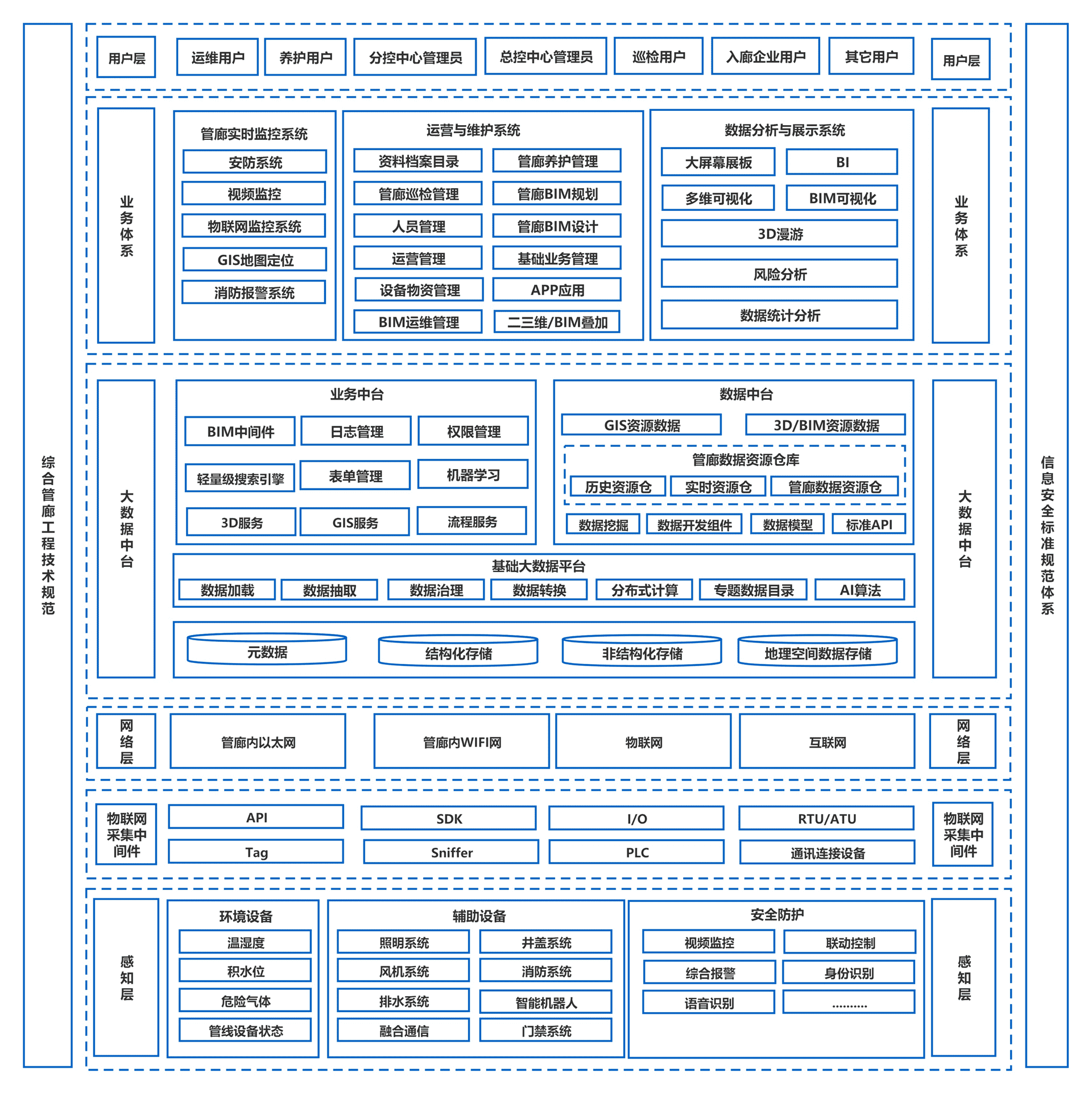 地下綜合管廊是指在城市地下建造一個(gè)隧道空間,將電力、通訊、燃?xì)?、供熱、給排水等各種工程管線集于一體,實(shí)施統(tǒng)一規(guī)劃、建設(shè),以形成一種集約化、可持續(xù)性的管線敷設(shè)方式,是韌性城市建設(shè)的重要組成部分。地下綜合管廊包含多種智能化系統(tǒng),其結(jié)構(gòu)復(fù)雜,需要統(tǒng)一的集成管理,通過建設(shè)地下綜合管廊管理平臺(tái)實(shí)現(xiàn)各系統(tǒng)統(tǒng)一管理、信息共享及聯(lián)動(dòng)控制。根據(jù)國標(biāo)《城市綜合管廊工程技術(shù)規(guī)范》(GB50838)要求,建設(shè)地理信息系統(tǒng)和統(tǒng)一管控平臺(tái),綜合管廊的建設(shè)應(yīng)向智慧化方向發(fā)展,通過結(jié)合BIM、物聯(lián)網(wǎng)、大數(shù)據(jù)技術(shù),建設(shè)智慧管控一張圖,智慧運(yùn)營(yíng)服務(wù)、智慧應(yīng)急、大數(shù)據(jù)分析等系統(tǒng)平臺(tái),覆蓋綜合管廊項(xiàng)目全生命周期,實(shí)現(xiàn)綜合管廊規(guī)劃、建設(shè)、運(yùn)行、維護(hù)及管理、服務(wù)的智慧化,保障綜合管廊全生命周期的安全、高效、智能、綠色,從而提升城市基礎(chǔ)設(shè)施功能和城市運(yùn)行能力。