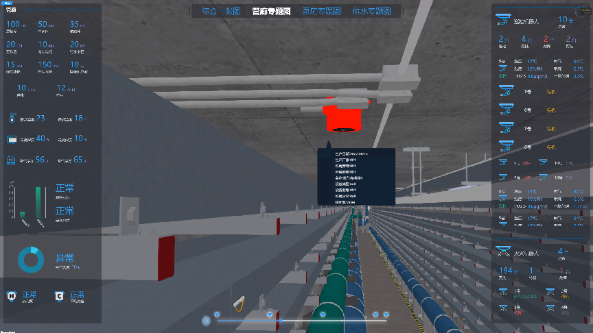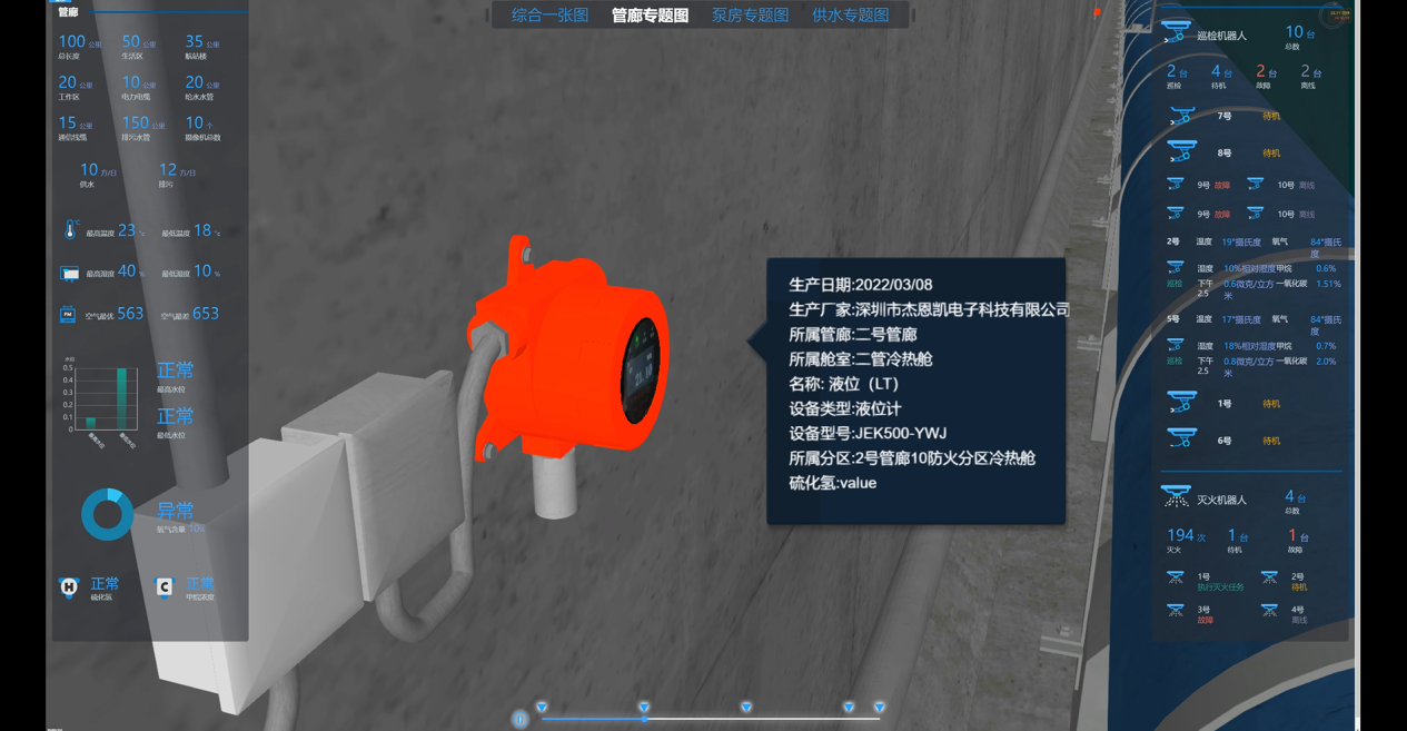 結(jié)合動(dòng)態(tài)時(shí)空變化數(shù)據(jù)(比如:人員和設(shè)備移動(dòng)、管廊照明、能源傳輸、災(zāi)害擴(kuò)散等),展示智慧管廊模型場(chǎng)景的動(dòng)效效果,使得管廊中的重要事件、關(guān)鍵元素更加突出,三維地圖展示具有實(shí)時(shí)動(dòng)態(tài)感,成為智慧管廊數(shù)字孿生的夯實(shí)底座。