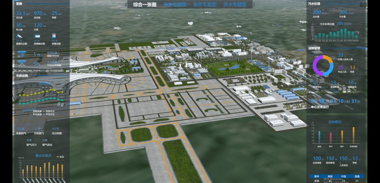 BIM模型和三維模型與GIS地圖坐標(biāo)重疊展示。地圖兩側(cè)采用圖標(biāo)形式數(shù)據(jù)展板,統(tǒng)計(jì)分析各類數(shù)據(jù),數(shù)據(jù)展板的內(nèi)容可根據(jù)需要自定義配置。可根據(jù)業(yè)務(wù)內(nèi)容配置綜合一張圖和各類業(yè)務(wù)專題圖。
