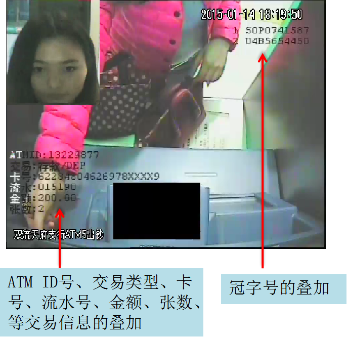 獲取ATM ID號、交易類型、卡號、流水號、金額、張數(shù)、等交易信息后疊加,為業(yè)務(wù)糾紛或案件舉證提供明確證據(jù)。