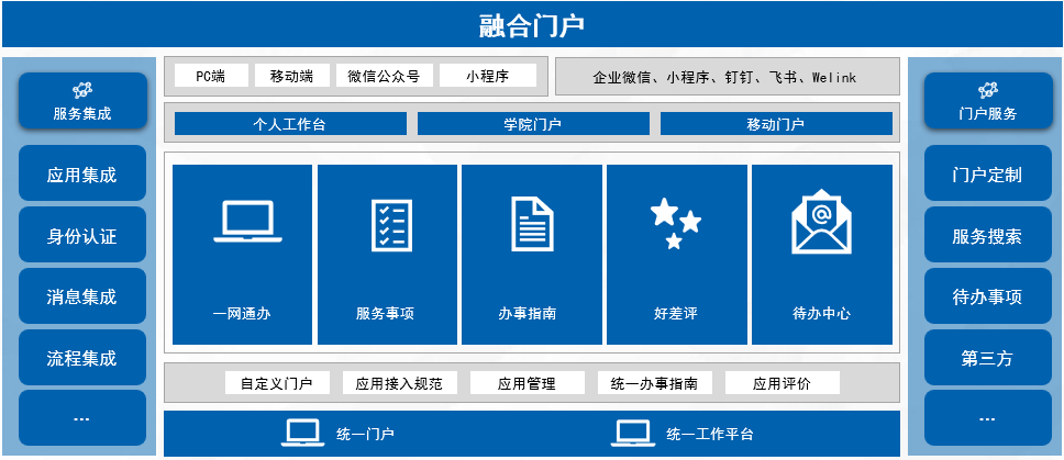 融合門(mén)戶是學(xué)校入口統(tǒng)一、部門(mén)協(xié)同、數(shù)據(jù)互通、一網(wǎng)辦理、高效便捷的智慧校園一體化服務(wù)平臺(tái),支撐線下窗口服務(wù)大廳、線上網(wǎng)上辦事大廳、移動(dòng)客戶端、自助終端等多種形式相結(jié)合、相統(tǒng)一的校務(wù)服務(wù)體系。推動(dòng)實(shí)現(xiàn)以統(tǒng)一身份認(rèn)證系統(tǒng)為基礎(chǔ)的“一號(hào)”互通,以智慧校園一體化服務(wù)平臺(tái)為支撐的“一站”受理,以校務(wù)服務(wù)管理平臺(tái)、為支撐的“一網(wǎng)”通辦。實(shí)現(xiàn)互聯(lián)網(wǎng)和校務(wù)服務(wù)深度融合,全面提升校務(wù)服務(wù)事項(xiàng)從受理、審批到辦結(jié)全流程網(wǎng)上辦結(jié)率。構(gòu)建跨校區(qū)、跨層級(jí)的一體化校務(wù)服務(wù)體系,大幅提升各級(jí)部門(mén)單位服務(wù)智慧化水平,讓校務(wù)服務(wù)更聰明,讓學(xué)生、教職工和社會(huì)公眾辦事更方便、更快捷、更有效率。